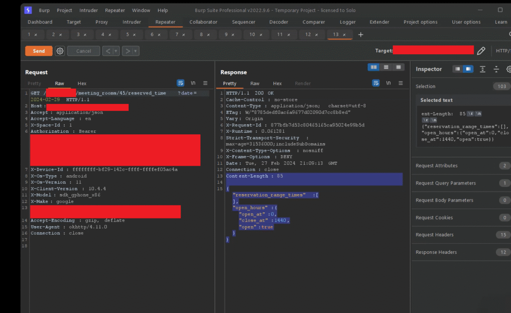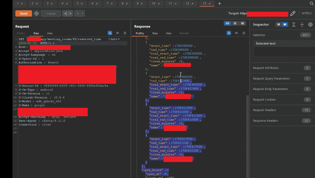After identifying the room availability feature, I captured the corresponding GET request in Burp Suite. When the room is available, the server responds with a JSON object containing the status—such as "open": true